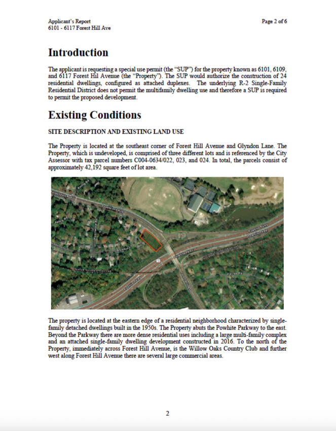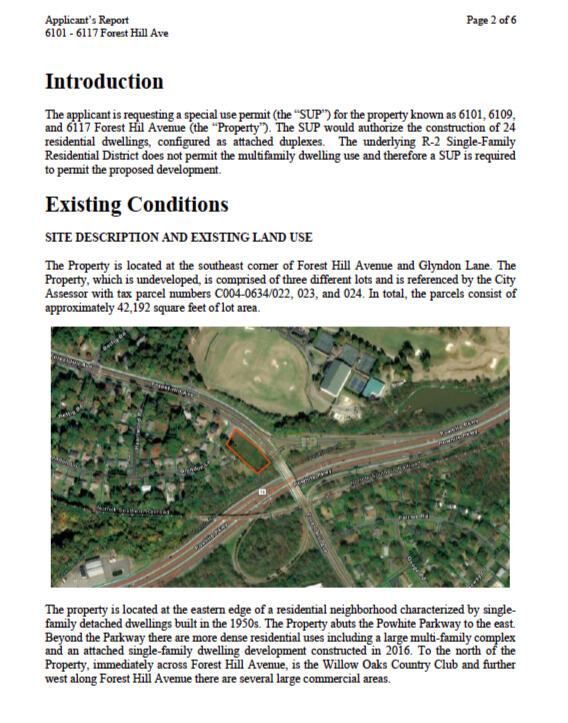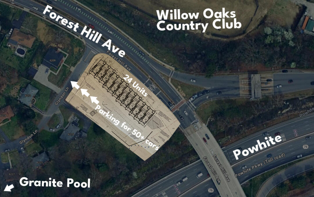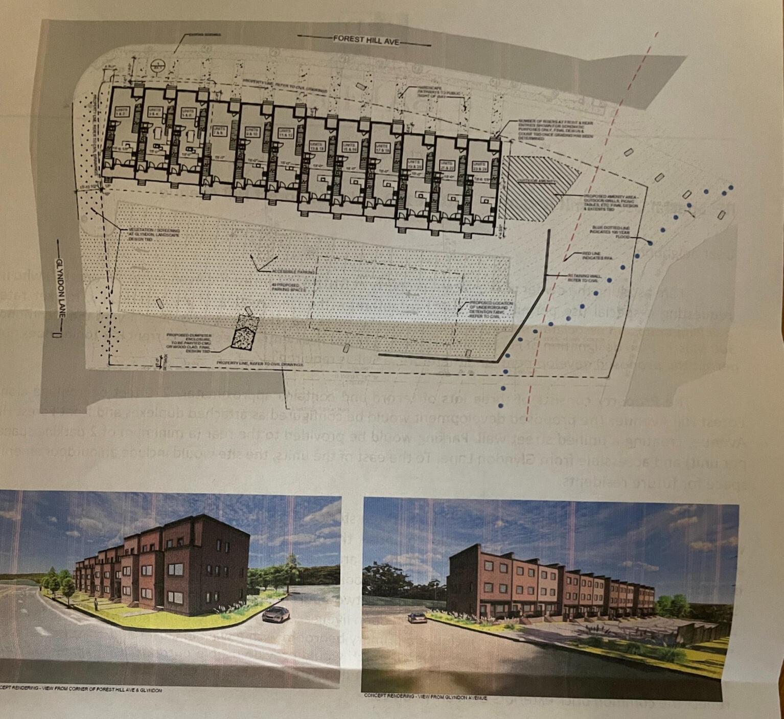 A Special Use Permit is under review to build 24 dwelling units (12 duplexes), for individual sale, each three stories high.The three lots currently allow only three single-family homes, so this is a major increase in density.The plan includes 50 parking spaces.Vehicle access will be via Glyndon Lane - there is no direct access to Forest Hill Avenue. This means all traffic from the development will be routed through the Granite Hills neighborhood.
