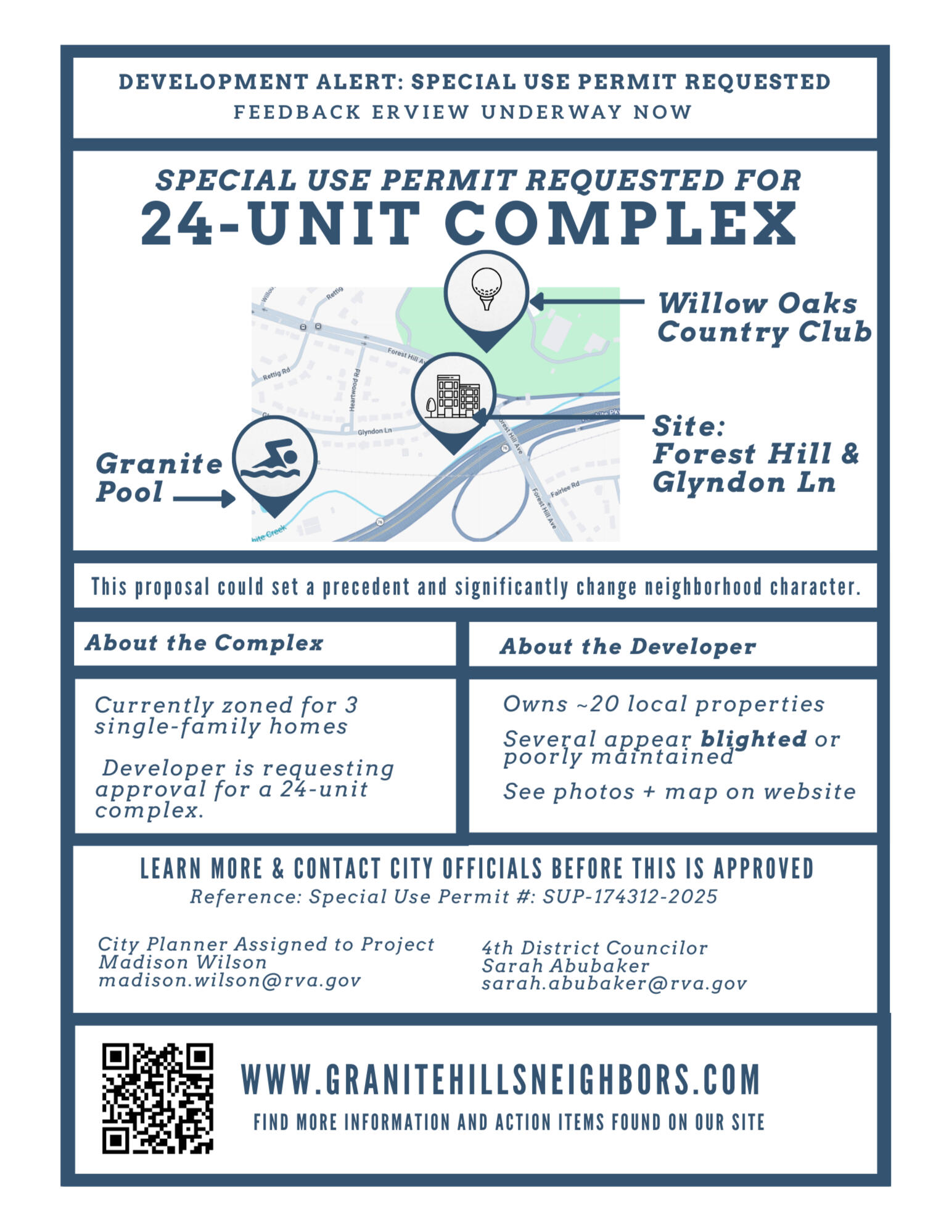 - A Special Use Permit is under review to build 24 units, three stories high.- The proposal would increase allowable density from 3 single-family homes to 24 dwelling units, requiring careful review of traffic, parking, stormwater, and neighborhood compatibility.- The plan includes 50 parking spaces, but no visitor parking- Vehicle access will be via Glyndon Lane - there is no direct access to Forest Hill Avenue. This means all traffic from the development will be routed through the Granite Hills neighborhood.