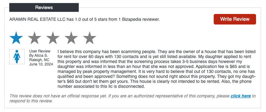 "... application fee is $65 and is managed by peak property management. It is very hard to believe that out of 130 contacts, no one has qualified and been approved? Something does not sound right about this property. They got my daughter's $65 but don't let them get yours. This house is clearly not intended to be rented. Also, the phone number associated to this llc is disconnected."